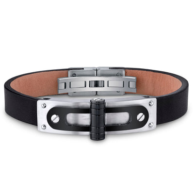 Men's Black Leather and Stainless Steel Bracelet Magnetic Fold-Over Clasp