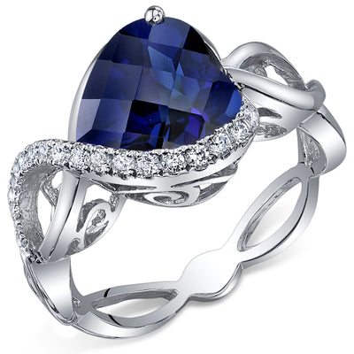 Main StoneLab Created Blue Sapphire4 caratsHeart Shape9x9mmCeylon Blue HueEye CleanAccent Stone(s)Cubic ZirconiaRound Brilliant CutPremium GradeMetalSterling Silver925 stamp3.4 gramsRing features exceptional Design, Craftsmanship and Finish. Blue Sapphire is the Birthstone of September. Perfect gift for Mothers Day, Birthdays, Valentines Day, Graduation, Christmas or just about any other occasion. Style SR10710