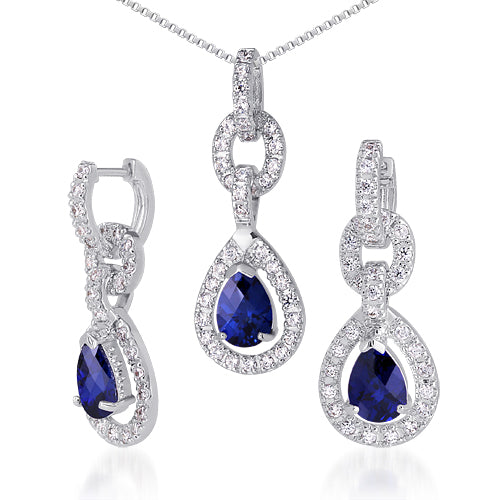 Blue Sapphire Teardrop Earrings Pendant Necklace Sterling Silver Jewelry Set