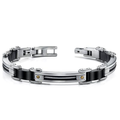 Features: Alternating Black and White Cable in the links, 18 Karat Gold Rivets, alternating black stainless steel links. Rugged Stainless Steel Construction.