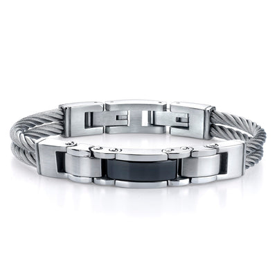 Brushed polish-finish, hypo-allergenic, biocompatible 316 L Stainless Steel Cable-style strap Bracelet with Dual finish Panther link centerpiece adds a unique and refined style to a charming personality.