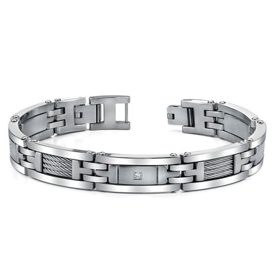 Features: Twisted Cable highlight, Cubic Zirconia Accents, Matte Finish, Rugged Stainless Steel Construction.